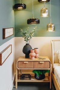 Os pendentes assumem protagonismo ao formar uma espécie de escultura ao lado da cama. As profissionais utilizaram os modelos Wazon e Lazon, da importadora de iluminação Nordecor, que diferem em suas cores, mas têm o vidro como ponto em comum – material que garante a sensação de bem-estar e conforto tão necessários para o relaxamento diário. Com formatos mais arredondados, as peças reforçam o conceito contemporâneo do projeto.