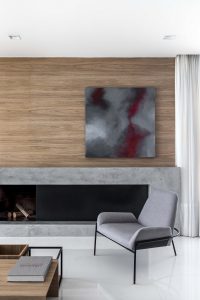 Seguindo uma paleta de cores minimalista, o projeto conta com elementos em preto, cinza e branco, combinados com o toque aconchegante da madeira. Essa escolha permitiu às profissionais acrescentarem pontos de destaque ao apartamento através de obras de arte, como a tela em óleo sobre a lareira, da artista plástica Dea Fylyk, móveis soltos, objetos de decoração e paisagismo.