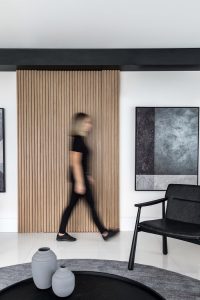Ainda neste mesmo ambiente, o painel/porta ripada dá acesso principal ao apartamento e demarca a iluminação dos quadros da Urban Arts, nesta entrada.