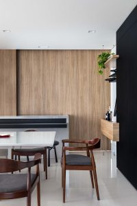 O ponto de partida foi a integração da churrasqueira, antes parte de uma varanda externa, à sala de jantar, proporcionando um espaço muito mais amplo aos moradores. O acesso se dá por uma porta de correr, podendo agregar mais privacidade aos ambientes – além de aquecer e dar um charme especial ao décor com o revestimento amadeirado.