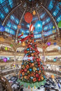 O mesmo tema que inspira a campanha também ganha forma e beleza que se traduzem em magia por todo o magazine. Se, externamente, todas as vitrines voltadas para o Boulevard Haussmann enchem os olhos dos pedestres, é internamente que se encontra a tradicional árvore natalina, erguida – como em todos os anos – exatamente sob a secular cúpula do histórico edifício e reconta, com referências a países os mais diversos, adereços, enfeites e efeitos especiais, as aventuras da jovem aviadora.