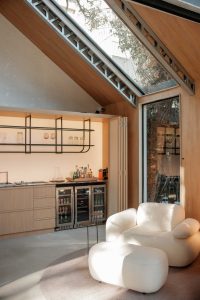 O destaque fica por conta da marcenaria, que conta com os padrões da Sudati MDF, Tauari e Jaspe, aplicados tanto na cozinha com portas retráteis, como nos painéis presentes em quase todos os ambientes da cabana. Além de trazer uma abordagem mais sustentável ao projeto, a escolha também traz unidade aos quatro ambientes internos da casa.