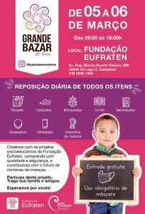 Com entrada gratuita e seguindo todas as recomendações sanitárias para evitar aglomerações, a Fundação Eufraten faz, nos dias cinco e seis de março, sua primeira edição, em 2021, do Grande Bazar do Bem. Desta vez o evento será no próprio local onde a fundação atua, e o atendimento ao público começa às 9 horas da manhã e vai até às 16 horas da tarde nos dois dias, ou seja, na sexta e no sábado. O endereço é Avenida Engenheiro Márcio Duarte Ribeiro, 500, Jardim do Lago II, em Campinas, SP e todos devem usar máscara durante todo o tempo de permanência no bazar.