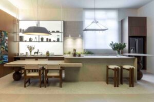 O Living Raízes, de Manuela Senna se destaca como uma sala-bar inspirada na arte de receber. A composição valoriza formas orgânicas e texturas que evocam memória e pertencimento. Os tons terrosos criam uma atmosfera serena e sensorial, com foco no bem-estar.