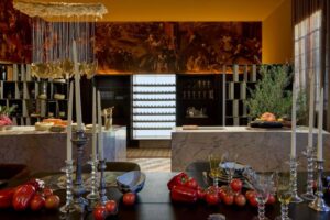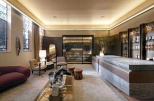 Beth Nejm também aposta em um ambiente para receber com a sua Confraria. A paixão por vinhos se revela na vasta adega, e o destaque fica por conta do painel desenvolvido pelo Studio K2, que desconstrói digitalmente a obra Feira de Camponeses (1570), de Peeter Baltens. Cores fortes, acabamentos finos e mobiliário moderno dialogam com detalhes clássicos, criando uma atmosfera elegante e atemporal.