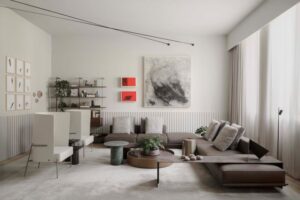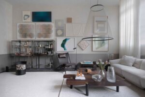 A Sala Elos, de Gislene Lopes, é outro espaço pensado para quem gosta de receber. O destaque fica por conta das peças desenhadas pela arquiteta, como o balcão em pedra sabão e madeira, a estante e a marcenaria, além da presença marcante da arte, que reforça o caráter autoral.
