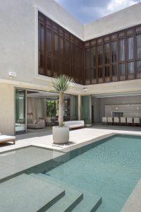O pátio central da casa é um capítulo à parte, já que além de contar com piscina, se integra completamente aos ambientes interiores quando as portas estão abertas.