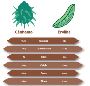 Valores referentes a 100 gramas de cânhamo e a 100 gramas de ervilha