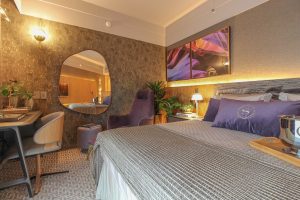 O espaço foi idealizado para receber os hóspedes do hotel, com conforto e sofisticação, sem deixar de lado a otimização com intervenções pontuais e sustentáveis, aproveitando o máximo das instalações existentes. Entre os materiais escolhidos, o destaque fica para a madeira que traz acolhimento e os tons de cinza e dourado, responsáveis por garantir elegância ao quarto, o toque de personalidade é conquistado pela cor uva, eleita a cor deste inverno. Entre as texturas, sobressaem as geometrias do piso em carpete. Os móveis enfatizam o design brasileiro e complementam o conceito apurado de refinamento. A cabeceira criada e desenhada pela profissional, envolve toda a cama e cria um ambiente de aconchego, é o toque final e exclusivo do projeto.