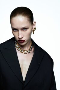 Entre o mix de produtos, estão brincos longos, curtos e front back, piercings que vão dos modelos mais delicados aos maxi, colares de comprimentos variados, chokers, pulseiras e anéis pensados para diferentes composições. Cada peça traduz o DNA da Hector Albertazzi, elevando e protagonizando qualquer produção.