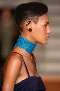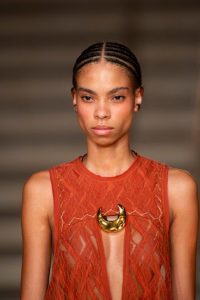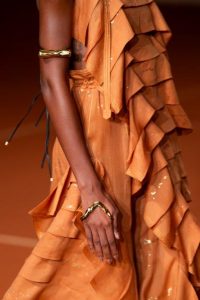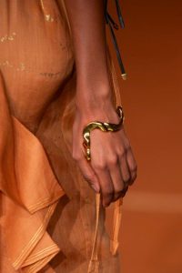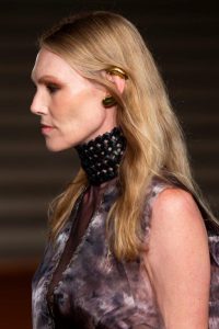 A colaboração deu vida a um brinco que envolve a lateral da orelha, pulseiras de mão, dedeiras e dois hair pieces, todos desenvolvidos à mão, banhados a ouro e marcados por um design opulente, curvilíneo e que abraça o corpo.