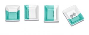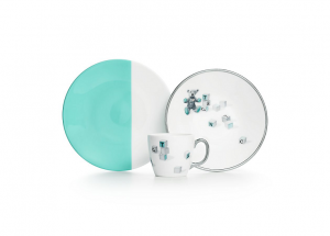 Em outras peças, um padrão de bloco de cores traz um toque moderno a o icônicoTiffany Blue® aplicado a um serviço clássico de chá em porcelana e acessórios de couro.