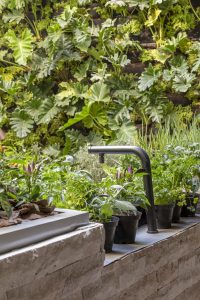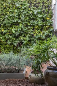No exterior, criou-se no muro o jardim vertical, que é verdadeiro oásis de beleza e tranquilidade por suas diferentes espécies de plantas, que dão um visual único e encantador. Entre as folhagens, destacam-se duas em especial: o Philodendro Ondulata, exuberante por suas folhas verdes e vibrantes e o Boldinho, com flores roxas bem delicadas. A natureza ainda se expressa em vasos com alecrim, manjericão, lavandas e um mix de ervas, que inclui peixinho, arruda, salsa, pimenta, cebolinha, pimentão e hortelã, que trazem um aroma agradável ao ambiente.