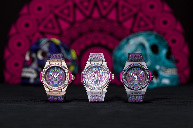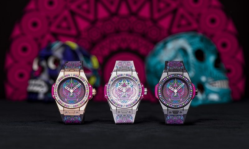 Sua pulseira, costurada com caveiras multicoloridas, imprime o espírito festivo de seus vestidos coloridos e elegantes. Seu aro é exibido sob um arco-íris de 42 safiras. Uma edição limitada que se veste de aço e exibe o mostrador em laca branca, que combina com sua pulseira de couro branco costurada em borracha branca (100 exemplares). Mas também se veste de cerâmica preta (mais 100 exemplares) e de ouro Hublot King Gold (50 exemplares) – ambos combinam com um mostrador preto em laca e uma pulseira em couro preto costurada em borracha preta.