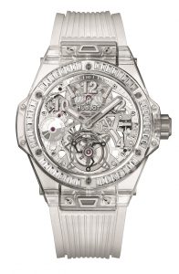 Fusão de claridade e pureza, o Big Bang Sapphire Tourbillon se apresenta também em uma variação engastada com 48 diamantes em formato baguette. Incorporadas na safira do bisel, essas pedras preciosas abraçam esta joia com suas múltiplas facetas, visíveis por todos os lados. No punho, ambos brincam de invisibilidade com uma pulseira de borracha transparente com estrutura em linhas.