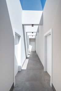 Para iluminar o corredor e eliminar a sensação de espaço estreito provocada pela sua extensão, a arquiteta apostou na iluminação zenital | Foto: Julia Herman
