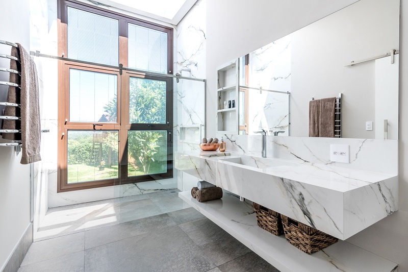 Para o piso, a arquiteta recomenda optar por revestimentos que não esquentam, como os porcelanatos, pois contribuem para propagar a luminosidade que chega ao ambiente.
