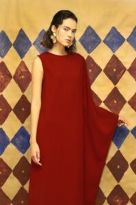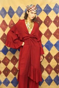 A paleta quente — que transita entre vermelhos profundos, dourados queimados, violetas e tons de areia — evoca elementos como terra e fogo, conectando destino, força e sensibilidade. As silhuetas fluidas, os volumes delicadamente construídos e os detalhes artesanais dão forma a peças que parecem estar sempre em movimento, acompanhando o ritmo natural de quem as veste.
