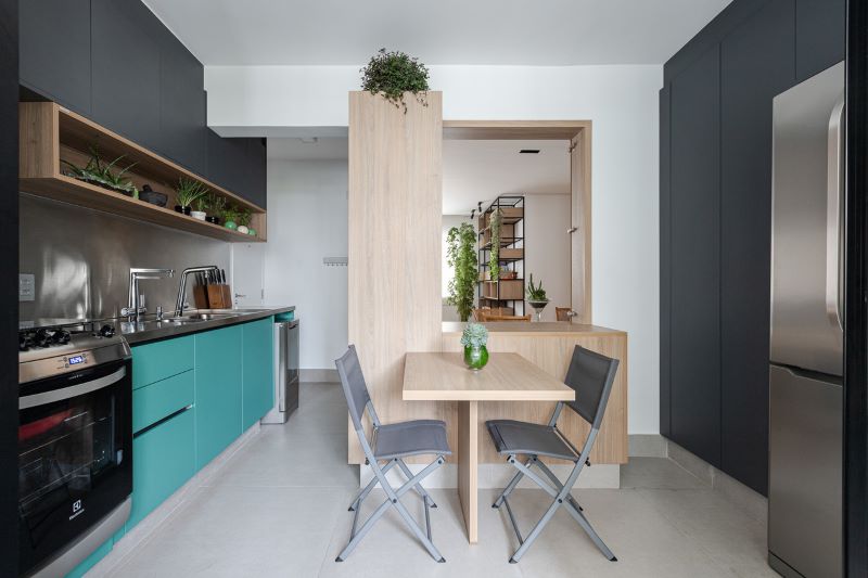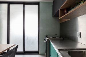 A cozinha foi o ambiente que a cliente mais investiu, pois queria uma bancada e frontão em inox com duas pias, duas torneiras e triturador. E pra quebrar um pouco a frieza do inox o escritório optou por uma mistura de cores e texturas na marcenaria na cor verde, cinza e a madeira que dão alegria e aconchego ao ambiente.