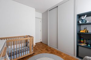 O mesmo princípio foi utilizado na separação do escritório com o quarto de bebê. A parede que separava esses dois ambientes foi demolida, em seu lugar foi feito um grande armário para dividir os ambientes. Assim, parte do móvel atende o escritório e a outra parte atende o quarto de bebê. No quarto do filho, optaram por um acabamento em azul petróleo e cinza platina e no lado do armário que abre para o escritório o acabamento ficou no tom de gianduia e nude.