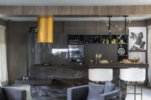 Na Casa Sumë, Gustavo Neves trouxe a junção do rústico à mais alta tecnologia com o granito Cygnus em sua bancada.