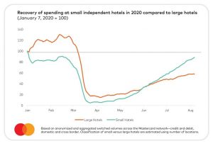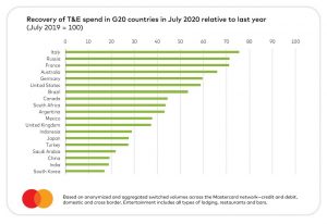 A análise das atividades de venda agregadas por toda rede Mastercard, mantendo a anonimidade e incluindo vendas online e offline, revela que dentro do G20, Itália, Rússia e França estão no topo em relação a recuperação de seus gastos com viagens e entretenimento, com níveis muito parecidos com 2019. Isso inclui sub setores da categoria como passagens aéreas e hospedagem, assim como comer fora. Embora a Itália tenha sido o foco da pandemia no início do ano, a forte cultura gastronômica e indústria do turismo doméstico consolidada no país ajudou na recuperação mais rápida quando comparada a outros mercados como os E.U.A, Brasil e Índia.