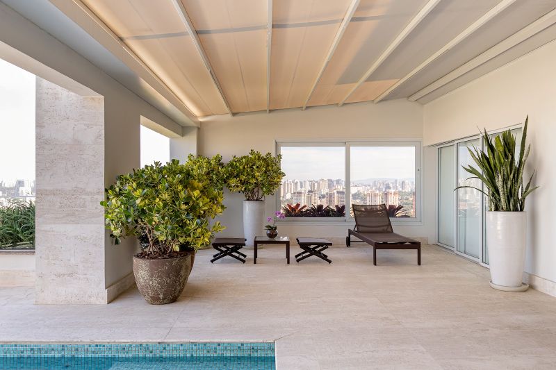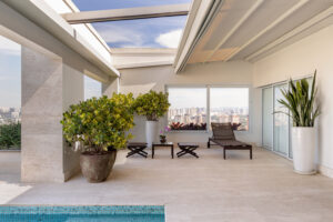 A cobertura duplex de 1000m², projetada pela arquiteta Jóia Bergamo, ganhou vida com uma área externa que reflete o estilo de vida sofisticado e acolhedor de seus moradores: um casal que adora reunir amigos e familiares para momentos de descontração, vinho e bons diálogos sob o céu de São Paulo.