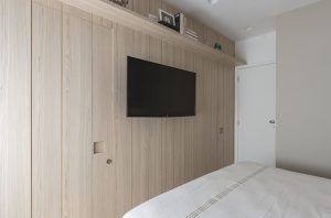 Na suíte do casal de 11,40m² foi utilizada uma tendência minimalista para trazer tranquilidade, aconchego, felicidade e acolhimento. Cores neutras, sóbrias com pouco contraste e com marcenaria simples, para deixar o cômodo confortável e iluminado. No painel em marcenaria de acabamento CIPRES, da Guararapes, esconde o banheiro da suíte e um pequeno closet, logo de entrada.