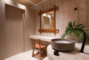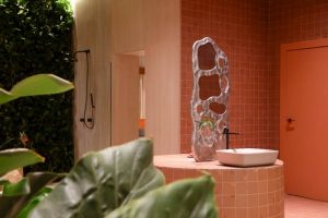 Os quase 100m² do ambiente “Caminhos Deca” simbolizam a ideia de um percurso, um trajeto que convida o visitante a explorar e se conectar com a natureza, da mesma forma que os povos indígenas se ligam aos seus ambientes aquáticos. Para compor o espaço, Juliana utilizou elementos que simbolizam a ancestralidade indígena. “O uso de revestimentos que lembram a cerâmica indígena reforça essa conexão respeitosa com a água, criando um diálogo entre tradição e inovação. Optei por utilizar materiais como palhinha, peças e louças em tons terrosos, além das torneiras em tons de cobre e uso da madeira. Também fiz questão de incluir o espelho e a cadeira Cuiabá, de Sérgio Rodrigues, que ele desenhou na década de 80 para o Hotel Eldorado em Cuiabá”, contextualiza a arquiteta.