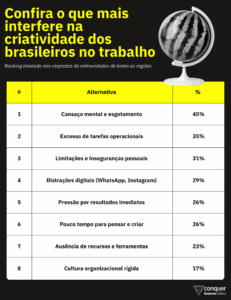 Mesmo que, hoje, 74% dos respondentes reconheçam exercer tal competência no meio de trabalho frequentemente, obstáculos para uma jornada mais criativa nas empresas parecem não faltar. Quando indagados, por exemplo, certas distrações digitais, como Instagram e WhatsApp (29%), a ausência de ferramentas (23%) e a cultura organizacional rígida (17%) apareceram entre os impeditivos mais comuns, ao lado do pior dos problemas: a sensação constante de cansaço mental ou esgotamento (45%).