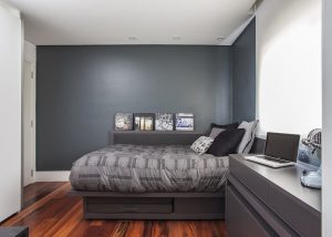 Contígua ao móvel, a bancada de estudos pode ficar escondida quando não está em uso. Boa ideia para otimizar o espaço no quarto do menino | Fotos: Eduardo Pozella