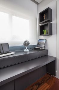 Quem tem criança sabe que qualquer dificuldade pode ser um motivo para não querer estudar e, por isso, é preciso investir em móveis que tornem o espaço mais agradável e estimule esse momento, além de um ambiente que ofereça tranquilidade e boa acústica. A altura da bancada, por exemplo, deve ser adequada ao tamanho da criança, para que a coluna fique ereta durante o uso. “Em caso de móveis planejados, uma opção bacana é investir em um tampo que possa ser colocado em diferentes alturas, acompanhando as diferentes fases da criança”, diz Karina. A mesa de estudo deve ter, no mínimo, 80 cm de largura e 50 cm de profundidade, medida ideal para apoiar todos os objetos, além de oferecer área suficiente para abrir e movimentar computador, livros e cadernos.