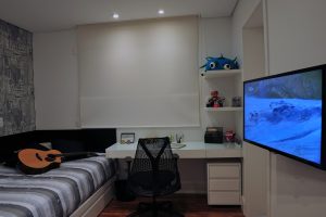É preciso acertar ainda na altura da mesa de estudos, que para os pequenos de até sete anos, recomenda-se até 65 cm de altura. Crianças maiores, incluindo adolescentes e adultos, vale adotar entre 73 e 83 cm. “Se colocarmos um padrão, procuro sempre investir em mesas de 76 cm de altura, que acaba sendo ideal para que a criança e adolescente use por muito tempo. Vale também fazer uma mesa inferior com 65 cm de altura como apoio para crianças menores”, explica Karina.