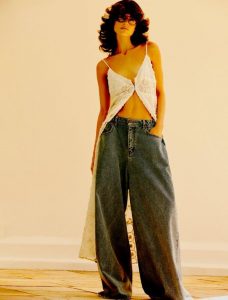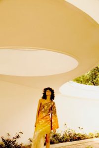 Os tons laranja, amarelo, verde e marrom também servem como ponto de partida para a criação da estampa exclusiva degradê com aplicação de um desenho floral em foil dourado, que dá vida a um modelo de vestido de um ombro só com corte assimétrico. Dentre os prints, o paisley está presente em vestidos longos de diversas modelagens, calças e regatas, que garantem o visual mais marcante dos anos 70.