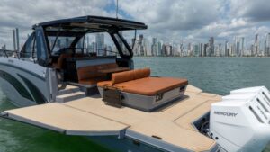 Com três quartos e dois banheiros, um diferencial inédito para a categoria de 44 pés, a lancha acomoda até cinco pessoas para pernoite e 16 tripulantes durante o dia. Internamente, o modelo oferece cozinha, sala de jantar e área de estar integradas, com acabamento de alto padrão. A tecnologia de navegação e os sistemas embarcados seguem o padrão das lanchas de grande porte.