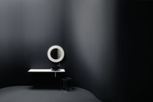A paleta cromática é o coração da coleção, com tonalidades que variam entre o lúdico e o contemplativo. Acessórios transparentes, coloridos ou em preto e branco interagem com a luz, criando efeitos visuais dinâmicos e atmosferas mutáveis. Produzidos com Saphirkeramik, os lavatórios de bordas ultrafinas exploram diferentes geometrias, com destaque para o modelo de piso monolítico, de forte presença arquitetônica.