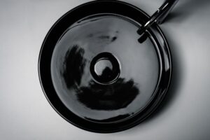 Cuba de apoio preto brilho com monocomando para lavatório em preto da coleção Kartell • LAUFEN – Foto: Divulgação Laufen