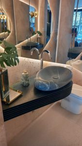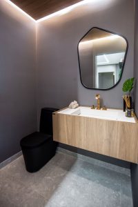 Para o arquiteto André Brandão, responsável pelo apartamento decorado do Sagô Marista, empreendimento da Séren Incorporadora, o lavabo tem a tônica geral da casa, que é mais suave e tem uma conexão com a natureza, mas que é tratado com um pouco mais de força, para que ele tenha personalidade. “Nós usamos materiais naturais como a pedra em várias tonalidades, pedra com menos polimento, mais natural e mais bruta para que tenhamos toque, textura, sombras, superfícies e dando nisso uma forma mais aconchegante”.