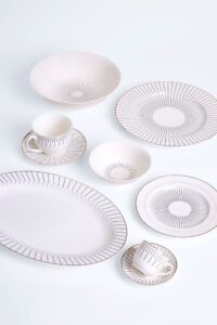 Ao todo, a linha é composta por sete itens: prato raso, prato de sobremesa, bowl, saladeira, travessa, xícara de café e xícara de chá, cada um pensado para integrar funcionalidade e estética, elevando a experiência de receber.