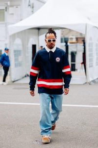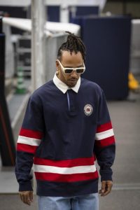 Lewis Hamilton vestiu uma clássica polo de rugby azul, com manga longa e listras vermelhas e brancas, da coleção International Games, acompanhado por uma calça jeans baggy, da coleção de primavera 2024 da Tommy Jeans.