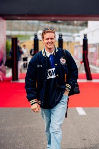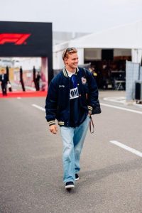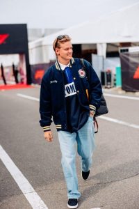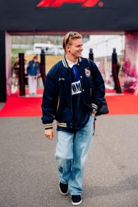 Mick Schumacher usou a clássica jaqueta varsity azul marinho e amarela, acompanhada por uma polo de manga longa, da coleção International Games, e uma calça jeans Aiden, da coleção de primavera 2024 da Tommy Jeans.