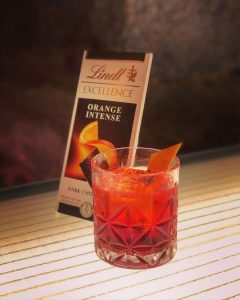 Ainda na intenção de estimular o apetite, porém agora com amargor mais evidente, a sugestão é o Negroni, considerado um dos drinks mais clássicos da coquetelaria, harmonizado com chocolate Lindt Orange Intense.
