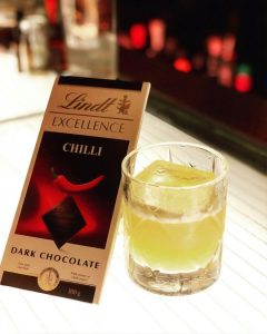 Para esquentar, a inspiração é o drink Penicillin feito à base de whisky. Como ingredientes termogênicos dão força ao Lindt Excellence Chilli e trazem essa sensação de calor quase que imediato, sem agressividade, porém persistente, a harmonização neste caso é por semelhança. O drinque dá força à picância do chocolate, enquanto a persistência do mesmo equilibra a defumação presente no destilado escocês.