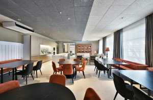 Em todo o espaço o teto terá revestimento acústico da linha Toccare, da empresa Greenplac, que possui textura de toque suave, remetendo à trama do tecido; e nas paredes será aplicado a linha Revolution, da by Kamy, que possuem um ótimo isolamento acústico e térmico, de fácil colocação e manutenção, em cima do lambri. Para o piso, o revestimento escolhido foi a coleção Battuto, da Cerâmica Portinari, que foi inspirado no Battuto Veneziano e traz a maravilhosa sensação das ruas de Milão para o espaço.