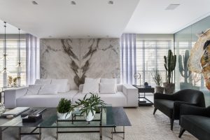 No hall, o túnel em madeira Tauari cria uma atmosfera natural em conjunto com o balanço Ipê. No living, o painel revestido de mármore Michelangelo Prime escovado contrasta com o painel ameixa, com aspecto metálico, e estabelece uma conexão com a escultura têxtil evidenciando o conceito orgânico. “Além da estética, a escolha do mármore vai de encontro a valorização de produtos e mão de obra locais atendendo ao conceito sustentável do projeto”, diz a arquiteta.