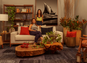 Já o trio, da Triarq Arquitetura assina uma sala íntima ideal para receber amigos para um bate-papo e um café. A inspiração foi o outono, e o espaço é aquecido pelo tom cobre das almofadas e também pela madeira de demolição, que se contrapõem com a modernidade do azul que utilizaram no Tapete Patchwork Ily e também nas almofadas. O volume de plantas foi inspirado em uma varanda interna, tipo jardim de inverno, onde é possível sentar para relaxar e ouvir uma música. O destaque fica por conta da Estante Jequitibá Leme, que traz memórias afetivas e uma coleção de livros.