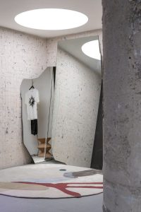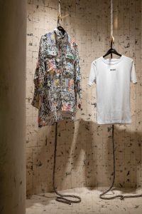 Os 73m² do ambiente (entre loja, vitrine e provador ) realçam o oposto entre elementos como o concreto e o latão, transformando os produtos em protagonistas da arquitetura. Em uma das paredes, há o revestimento cerâmico Índigo, lançamento da LEPRI, que traz em sua composição resíduos de tecidos descartados. A linha ganha destaque por ressignificar a forma de pensar dos projetos arquitetônicos e também por conversar com os valores da PERIGO, que utiliza o linho, uma fibra natural e biodegradável, como sua principal matéria-prima com a preocupação de seu máximo aproveitamento, desde a primeira coleção da marca.