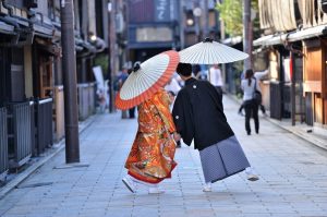Para complementar o álbum de casamento, vale fazer um ensaio fotográfico com trajes típicos japoneses em um cenário romântico. Quioto proporciona o plano de fundo ideal para isso. É possível adquirir ou alugar quimonos e contratar um profissional para registrar a lua de mel perfeita nas pequenas ruas de paralelepípedo cercada por construções históricas.