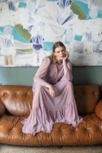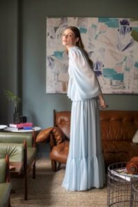 Outro destaque é o vestido Yasmin, slip dress consagrado em coleções anteriores, que ressurge bordado à mão com pedrarias e pérolas, adicionando textura e poesia à silhueta já querida pelas clientes. As batas, peças essenciais no universo Inglesis, ganham novas cores e tecidos, reafirmando seu lugar no guarda-roupa de quem valoriza conforto e leveza. A coleção também apresenta um novo vestido longo com gola dragê moderna e decote envolvente nas costas, que desenha o corpo com elegância intuitiva.