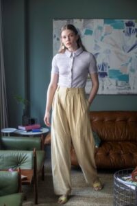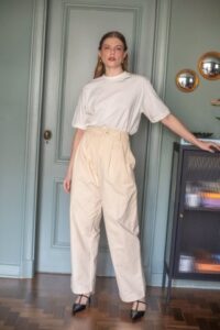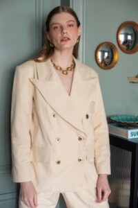 Entre permanências e novidades, ‘LUA’ equilibra clássicos revisitados e criações inéditas. O blazer Lauren, um dos ícones da Inglesis, retorna em tom creme — suave, sofisticado e atemporal —, agora acompanhado de uma nova calça com modelagem repaginada, pensada para dias versáteis com um toque de refinamento. Entre as peças inéditas, a jaqueta Max carrega uma história afetiva: criada a partir de uma modelagem vintage de uma jaqueta do pai das irmãs Inglesis, a peça surge com textura pêssego/suede e interior acetinado, unindo memória, forma e permanência.